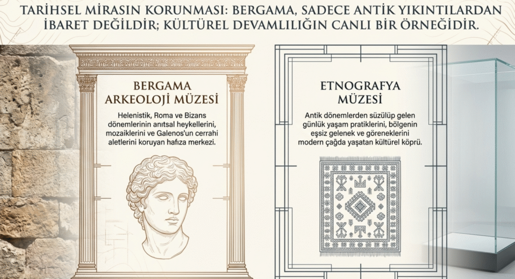 Ayrıca agoraları ve stadyumu ile Bergama günümüze kadar gelebilmiş önemli bir tarihi kenttir. Bergama’da Arkeoloji ve Bergama müzeleri Helenistik, Roma ve Bizans dönemi eserlerini sergilerken etnografya müzesi de gelenek ve görenekleri yansıtması açısından önemlidir.