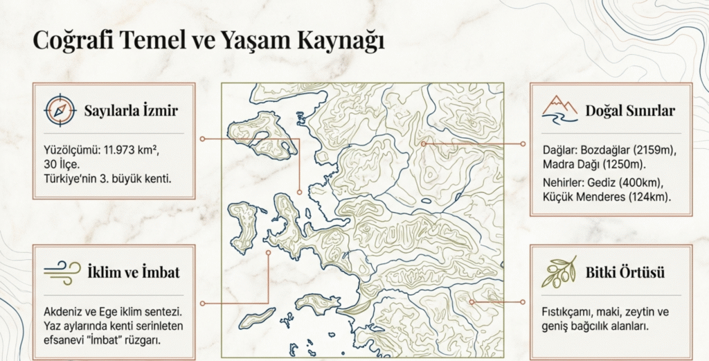 İzmir ili, denizin ılıman etkisini taşıyan dik ve yüksek dağlarla -1250 m, Madra Dağı, 1646 m, Cevizli Dağ-Aydın Dağı, 2159 m, Bozdağlar, Beydağ, Ömerdağ, Murat, Yamanlar, Kozak, 1500 m, Kemalpaşa, 1098 m, Dumanlı, 1218 m, Akdağ Sultan dağları, 1061 m, Geyiklidağ, Çamlıdağ- çevrilidir.
