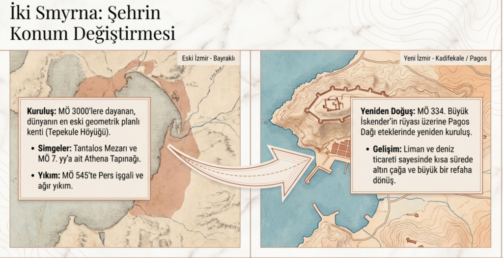 Persleri Anadolu’da bozguna uğratan Makedonyalı Büyük İskender, MÖ 334 yılında gördüğü bir rüya ile İzmir’i Pagos Dağı- Kadifekale’de deniz yönünde yeniden kurmuştur.