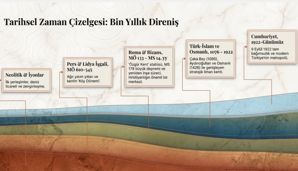 Zaman zaman devam eden istilalar sırasında Türklerle tanışmaya başlayan İzmir, 1076’da Selçukluların eline geçse de kent Bizans ve Türkler arasında sık sık el değiştirmiştir.