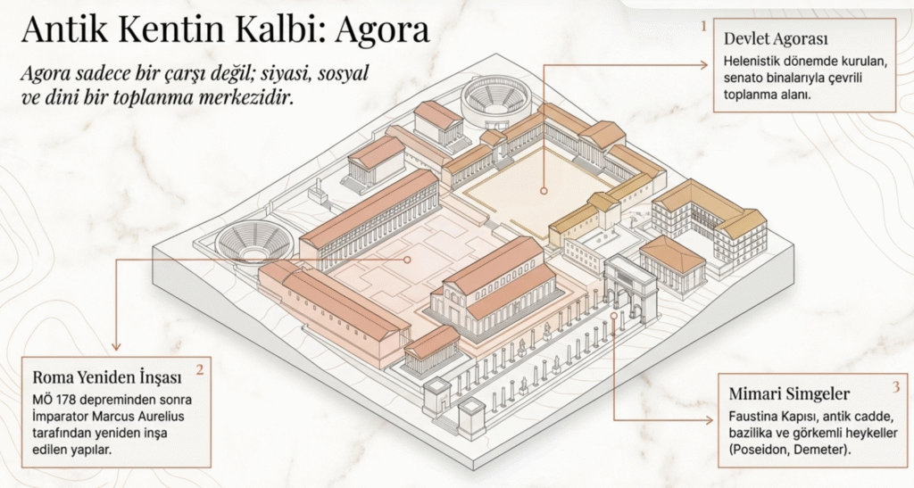 MÖ 178 yılındaki depremle bu binaların önemli bölümü yıkıldığı için 1923- 1941 yılları kazılarında ortaya çıkarılan agora kalıntıları genellikle Roma- İmparator Marcus Aurelius dönemi yapılarına aittir.