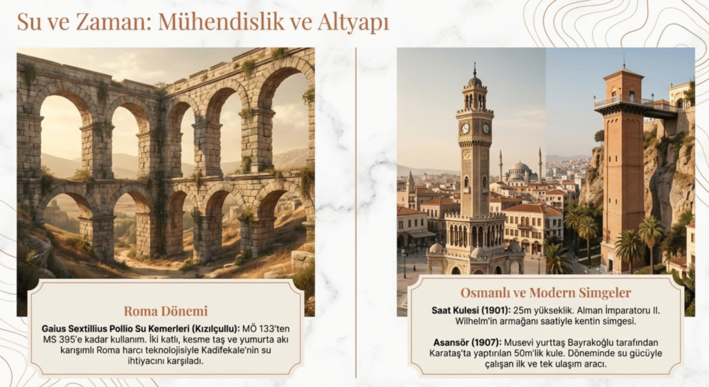 MÖ 133- MS 395 yılları arasında kullanılan su kemeri, Kadifekale ve çevresindeki su ihtiyacını karşılamak amacıyla Roma İmparatoru Augustus döneminde yaptırılmıştır.