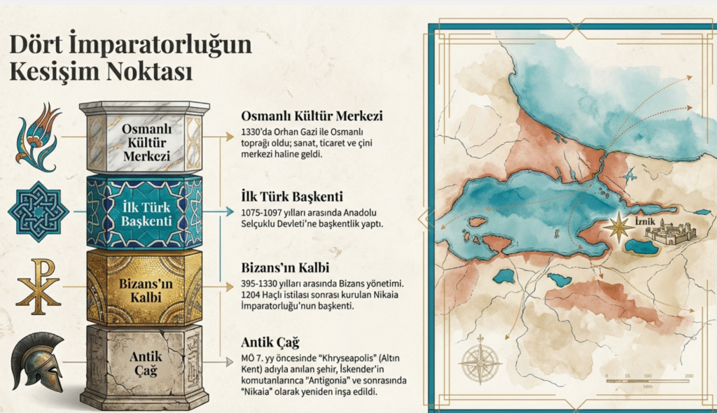 Başta büyük imparatorluklara Roma, Bizans, Selçuklu ve Osmanlı ev sahipliği yapan ve Osmanlı’nın Anadolu’ya açılan kapısı İznik, ilk çağlardan bugüne İstanbul, Konya, Antakya, Halep, Şam, Kudüs, Mısır ve Bağdat yollarını birbirine bağlamıştır.