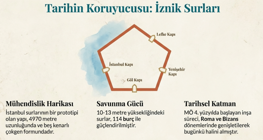 İznik kentine İstanbul surlarının küçük bir kopyası MÖ 4. yy.’da yapılan, Roma ve Bizans dönemlerinde genişletilen, 10m -13 m yükseklikte, 5 km’ lik beş kenarlı çokgen, 114 burçlu surlar arasından halen görülebilen dört kapıdan –İstanbul, Lefke, Yenişehir ve Göl veya İskele kapıları- girilmektedir.