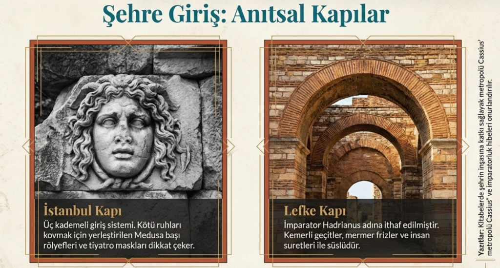 Lefke Kapısı’ndan kente girerken iki silindirik kule arasında kalın mermer sütunlarla üstü ağaç dikdörtgen kapı ile karşılaşılır.
