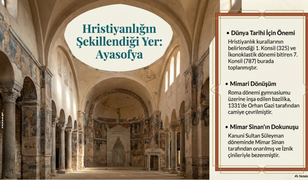 Daha sonra Bizans İmparatoru Justinianus tarafından tekrar yaptırılan ve zamanla depremlerden zarar gördüğü için çeşitli dönemlerde yeniden inşa edilen üç nefli (sahın) Ayasofya Kilisesi mimarisi, ihtişamı ve eşsiz süslemelerinin yanında Hıristiyanlık açısından son derece önemli bir dini yapıdır. Çünkü Hıristiyanlık kurallarının düzenlendiği toplantılardan 325 yılındaki 1. Konsil, ve 787 yılındaki 7. Nikaia Konsili, Ayasofya Kilisesi’nde toplanmıştır.