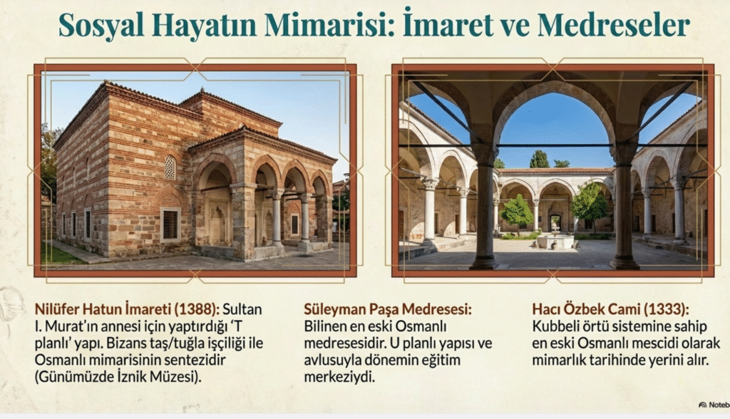 1388 yılında Osmanlı Sultanı I. Murat tarafından annesi Nilüfer Hatun anısına imarethane olarak inşa ettirilmiştir. Osmanlı’nın en güzel dönem mimari özelliklerini yansıtan T planlı bina, Bizans’ın renkli taş ve tuğla işçiliğine uygun olarak yapılmıştır. Tonoz kemerli revaklı girişin üstü kubbe ile örtülüdür. Buradan ana mekan ve yan alanlara geçilir.