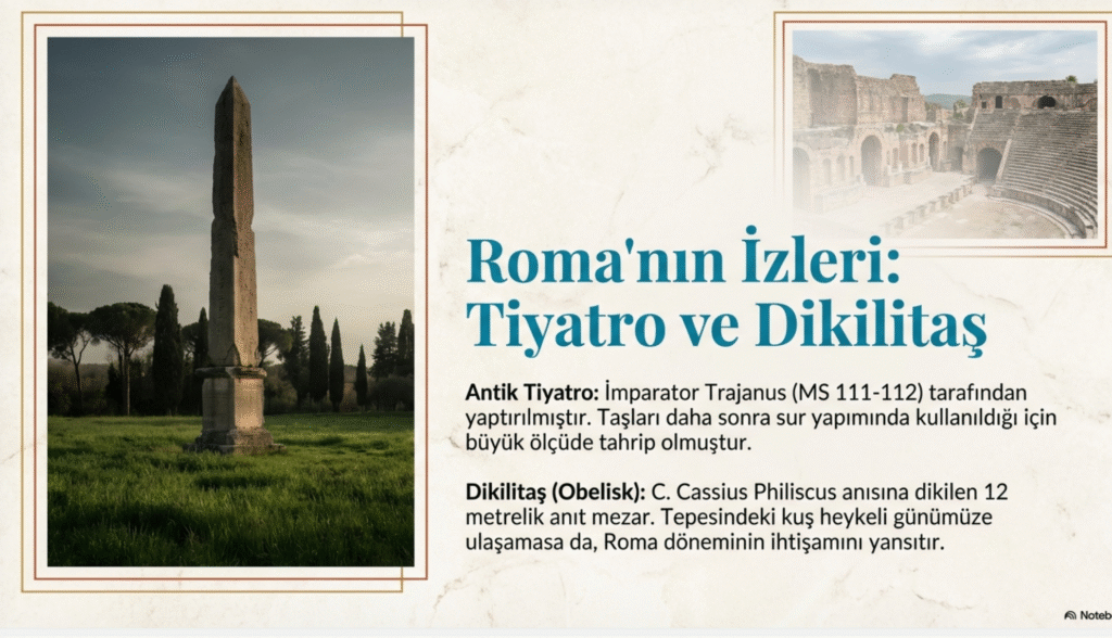 Ayrıca Roma Yolu üzerindeki kente yakın bir noktada I. yy. C. Cassius Philiscus’a ait olduğu düşünülen, üzerinde kartal ve zafer tanrıçası Nike’nin heykeli bulunan 12 m yüksekliğindeki anıt mezar Beştaş- Obelisk- Nişantaşı- Dikilitaş, 4. ve 5. yy. erken Hıristiyanlık dönemine ait, duvarları ve tavanı renkli fresklerle kaplı, içinde üç adet mezarın bulunduğu son derece büyük ve ilgi çekici mezar anıtı, Elbeyli- Hypoge ile iki yanında ikişer kilise bulunan Dromosiu dikdörtgen mezar odası, taş ve ağaçlarla süslü beyaz mermerden mezarların olduğu Elbeyli- Dörttepeler Tümülüsü kentin en eski tarihi tanıklarıdır.