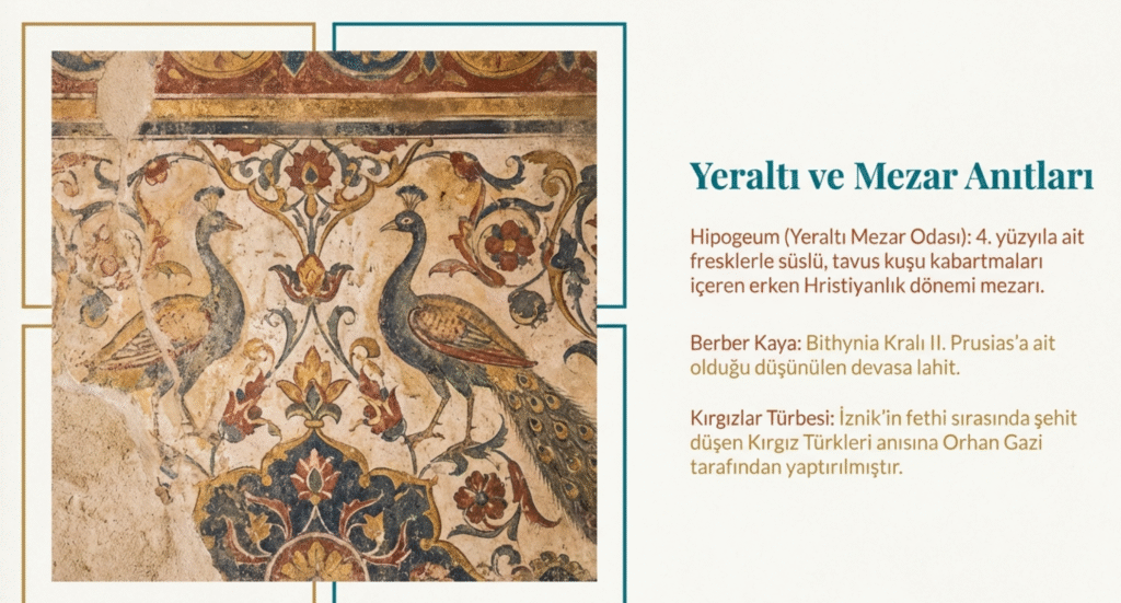 İznik’teki diğer önemli Roma yapılarından biri de konsül toplantılarının yapıldığı dönemin mimari özelliklerini yansıtan, zemin mozaiklerinden bahsedilen 325 yılında ve 11 Ekim 787 yılında üçyüzelli piskoposla çok sayıda keşişin katıldığı 7. Konsülün toplantılarının zaman zaman yapıldığı önemli bir yapı iken zamanla harap duruma gelen Senatüs- Konsül Sarayı, 4. yy.’a ait kare planlı, beşik tonozlu, fresklerinde iki tavus kuşunun da olduğu kabartmaları, yivli sütunları ve yuvarlak kemerleriyle dikkat çeken Elbeyli Köy- Hipogeum- Yeraltı Mezar Odası ile kentin çevresini kuşatan, 4970 m uzunluğunda 4 kapı ile girilen surlar ve kentteki tarihi kalıntılardandır.