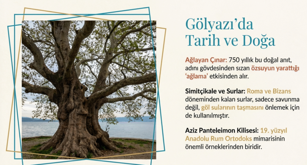 Bursa’ya 42 km uzaklıkta, bir yarımada üzerinde yer alan Gölyazı, MÖ 6. yy.’da varlığı bilinen antik Yunan kenti Apollonia ad Rhyndacum üzerine kurulmuştur.