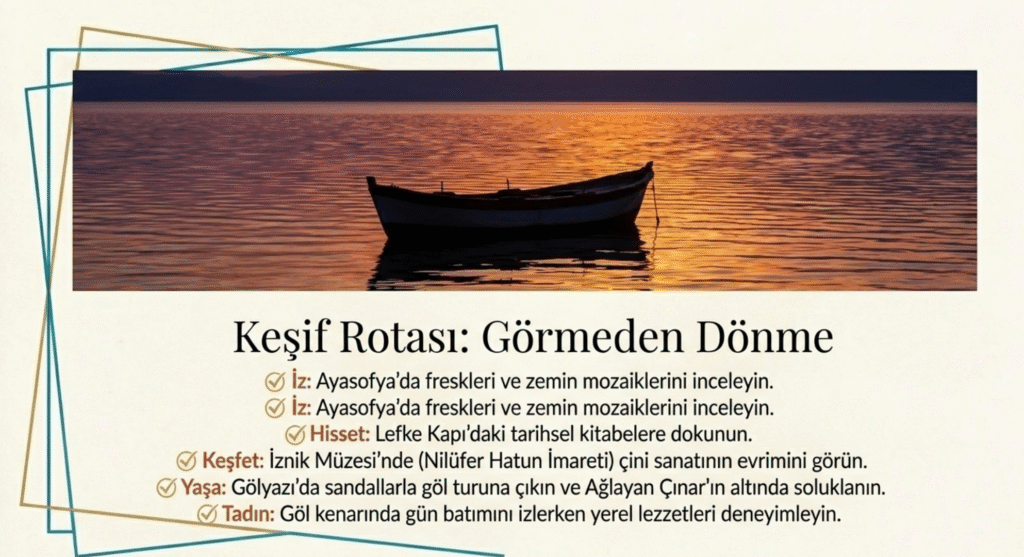 İznik ve çevresinde gezilmesi gereken önemli tarihi yapı ve yapıtlar ile doğal merkezlerden;