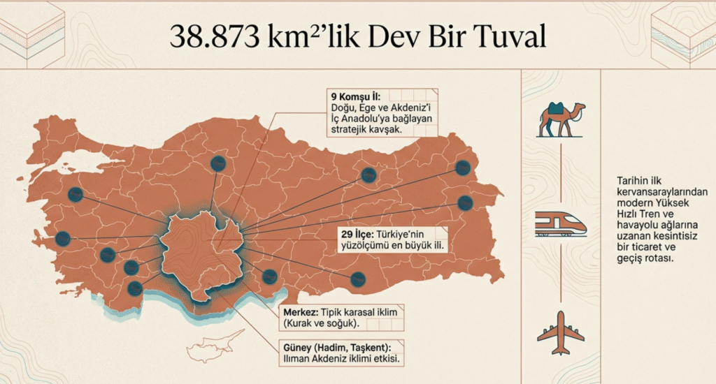 Komşular Ankara, Eskişehir, Afyonkarahisar, Isparta, Antalya, Mersin, Niğde, Karaman ve Aksaray illeriyle çevrili olan Konya, Türkiye’nin yüzölçümü en büyük bir ildir.