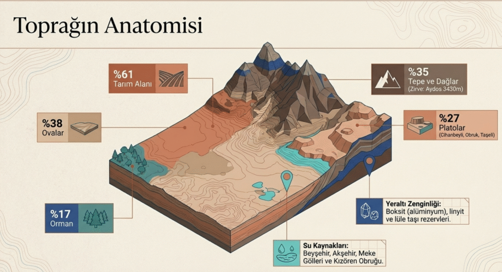 Toprakları  % 27 platolardanCihanbeyli, Obruk, Haymana, Taşeli– oluşan % 15 çayır ve meralara sahip Konya’da oldukça geniş bir alan % 61 tarıma ayrılmıştır.