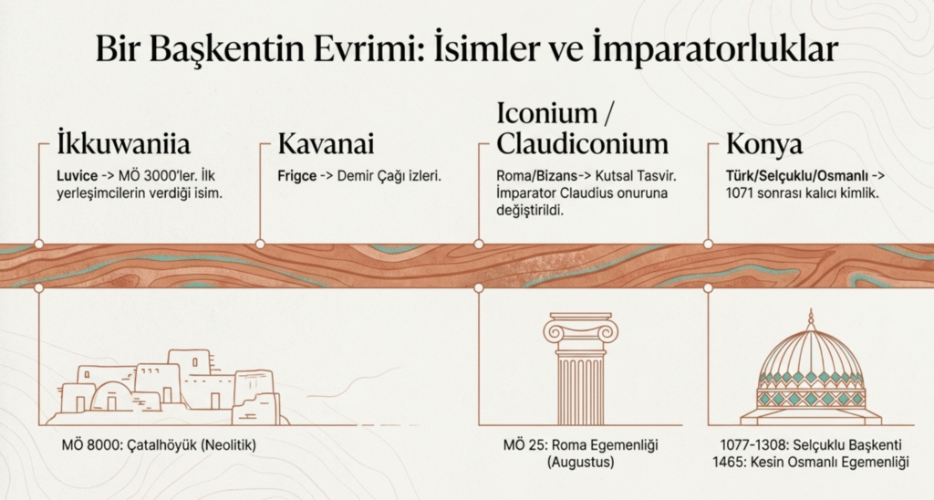 MÖ 3000- MÖ 2600 yoğun bir yerleşimin görüldüğü Konya’nın adı ilk sakinlerine göre adları Luvice – İkkuwaniia,  Frigce -Kavanai, Roma- İkonion- Ikonium -Kutsal Tasvir idi.