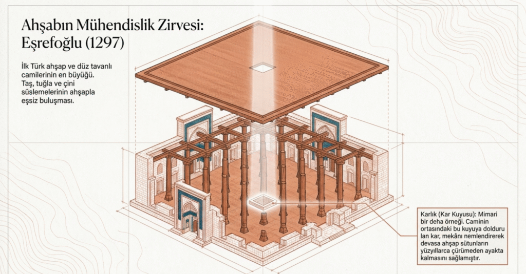 İlk Türk ahşap ve düz tavanlı camilerin en büyüğü olan yapının mimarisi, taş, tuğla, çini ve renkli boyalı süslemeleri son derece değerli ve dikkat çekicidir.