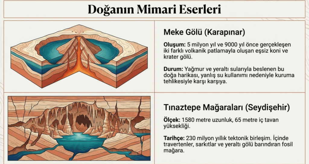 Seydişehir yakınında yatay bir zeminde 1580 m uzunluğunda, içi taban- tavan arası 65 m olan mağara, genç-yaşlı tektonik birimlerin iç içe geçtiği- 230 milyon yıllık- bir doğa harikasıdır.