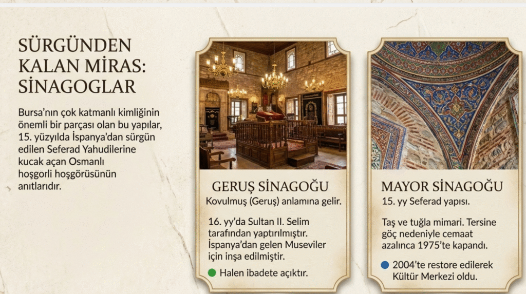 Arap Şükrü Sokağı’nda,İspanya’dan kovulan ve Bursa’ya yerleşen Museviler için İbranice kovulmuş anlamına gelen ‘Geruş Sinagogu 16. yy.’da Sultan II. Selim tarafından yaptırılmıştır.