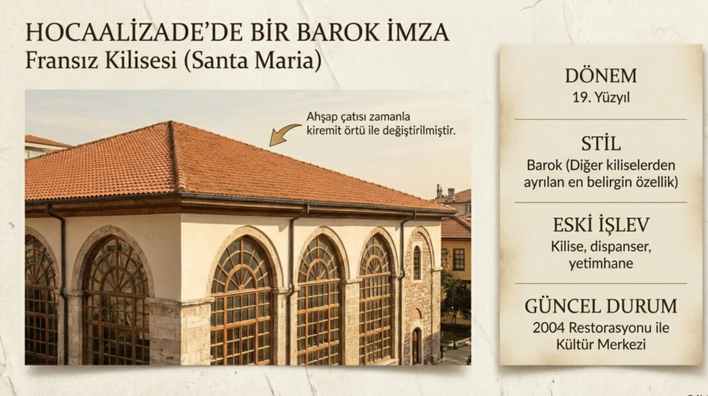 Bursa’nın bilinen semtlerinden Hocaalizade’de yer alan 19. yy. yapısı ilk olarak Santa Maria Kilisesi olarak hizmete açılmıştır.