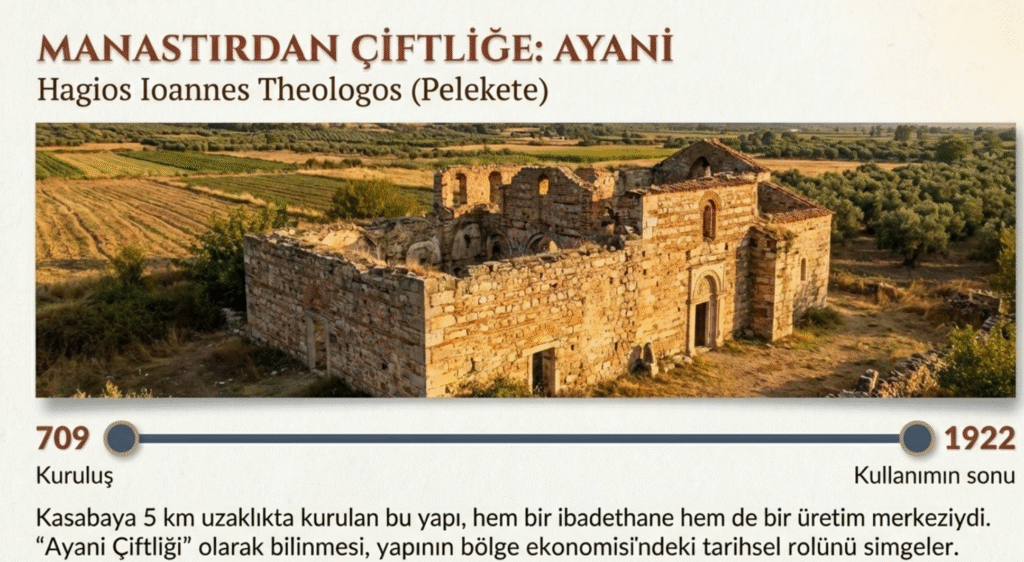 Bir diğer manastır kalıntısı ise kasabaya 5 km uzaklıkta, 709 yılında kurulan ve 1922 yılına kadar kullanılan Ayani Çiftliği olarak da bilinen Hagios Ioannes Theologos (Pelekete) Aya Yani Manastırı’dır.
