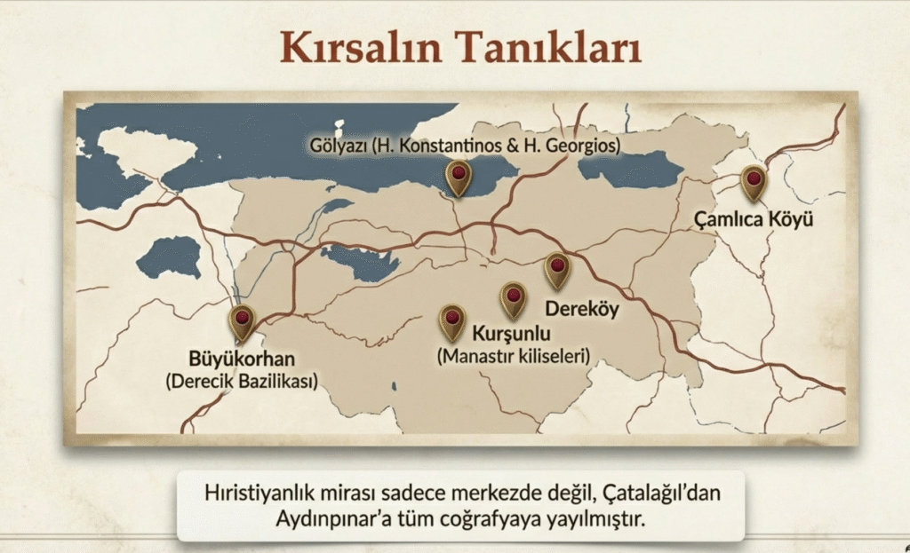 8. yy. IV. Konstantinos Porphyrogenetos zamanında, Piskopos Hyakinthos tarafından yaptırılan Meryem Ana’ya ait -Koimesis, Kimisis- ölüm sahnelerinin olduğu, freskler ve taban mozaikleriyle dikkat çeken zamanla depremlerle yıpranıp yıkılanKoimesis Kilisesi, 13. yy. Bizans İmparatoru, II. Theodoros Laskaris tarafından St. Tryphonos adına yaptırılan büyük kubbeli, taban mozaikleri ile öne çıkan Aziz Tryphonos Kilisesi, 4.ve 5.yy. haç planlı, duvarları beş sıra tuğla ile işlenmiş Karacabey- Helena Konstantinos Kilisesi,Mudanya -Hagios Tryphonos Kilisesi, Ayatrifon Kilisesi, Fransız Kilisesi ve Kumyaka Kilisesi bölgenin en önemli kiliseleridir.