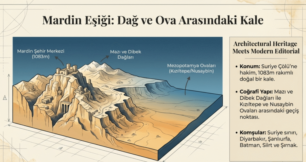 Çevresi ortalama 1500-1000 m. yükseklikteki dağ ve tepelerle –Mazı, Mardin, Alem, Dibek dağları, Gümüşyuva, Pirinç, Ziyaret, Karınca tepeleri– çevrili Mardin’in kışları da soğuk ve yağışlıdır.