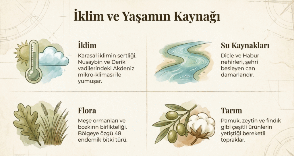 Mardin’in özellikle bazı ilçelerinde- Nusaybin, Derik ve Savur– görülen Akdeniz iklim etkisiyle pamuk, zeytin, fındık vb. ürünler yetişebilmektedir. Mardin ve çevresinde bulunan 622 farklı bitki türünün 48’i endemiktir.