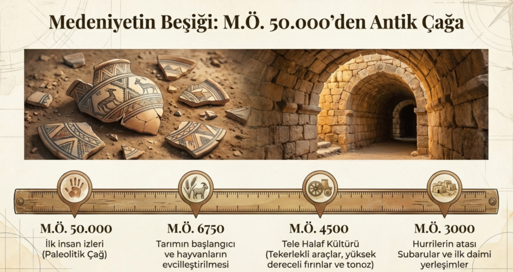 Kentin genelinde Sümer ve Akadlardan önce MÖ 3000-MÖ 2000 Hurrilerin atası Subarular ile ilk daimi yerleşimcilerinin MÖ 3000 yıllarına Hititlere kadar uzanmaktadır.