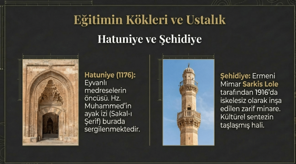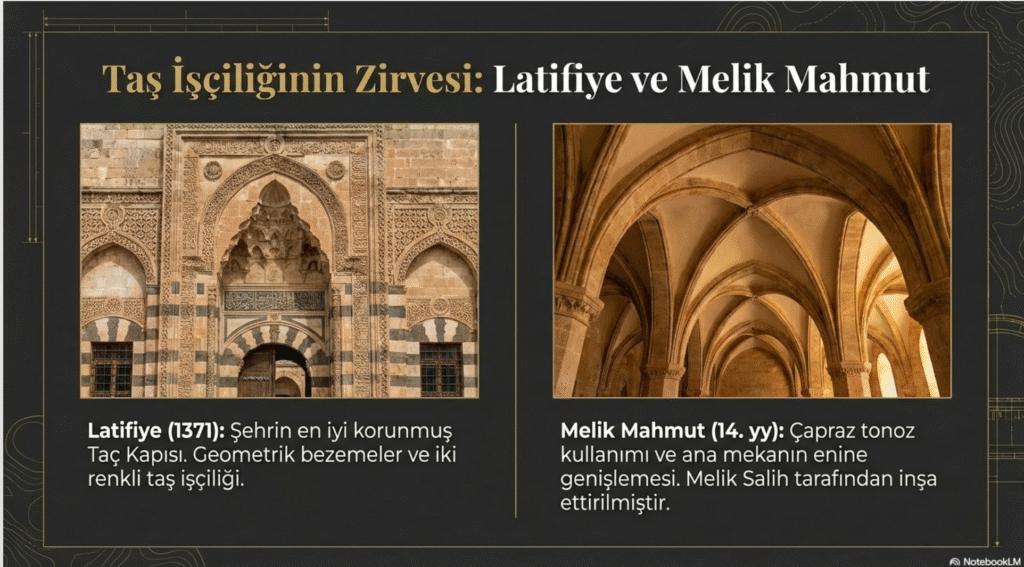 13. yy.’a ait, cami, türbe ve medreseden oluşan Beytil Artuki- Hacı Maruf- Marufitye, Harizm, Şehidiye medreseleri, Zerkan suyu kenarında, Artuklu Taceddin Mes’ud bin Abdullah tarafından yaptırılan ve zamanla yapılan eklemelerle genişletilen Kızıltepe- Harzem Taceddin Mes’ud Medresesi, Akkoyunlu İbrahim Bey tarafından eşi için yaptırdığı ve zamanla çok hasar gördüğü anlaşılan Şahsultan Hatun Medresesi olarak sıralanabilir.