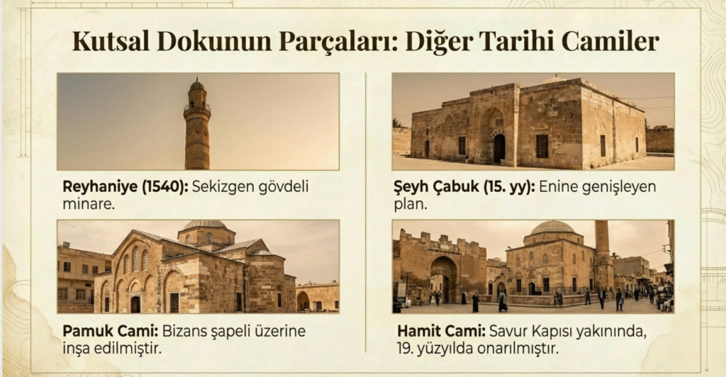 Hüsaliye Cami, Artuklu Sultanı, Necmeddîn İlgazi tarafından yaptırılan Necmettin Cami, Artuklu Eminuddin tarafından 1371 yılında yaptırılan, zamanla çeşitli defalar onarım gören, cami, medrese, hamam, çeşme, darüşşifa, bimarhane ve medreseden oluşan Eminüddin Külliyesi, Halife Cami, Hamit Cami, Sultan İsa, Hüsamiye, Muzafferiye, Malik Mansur, Savurkapı, Altıboğa medreseleri, 15. yy.’da Yenikapı Hamamı yakınında yapılan Şeyh Kasım Halveti Türbe ve Mescidi,