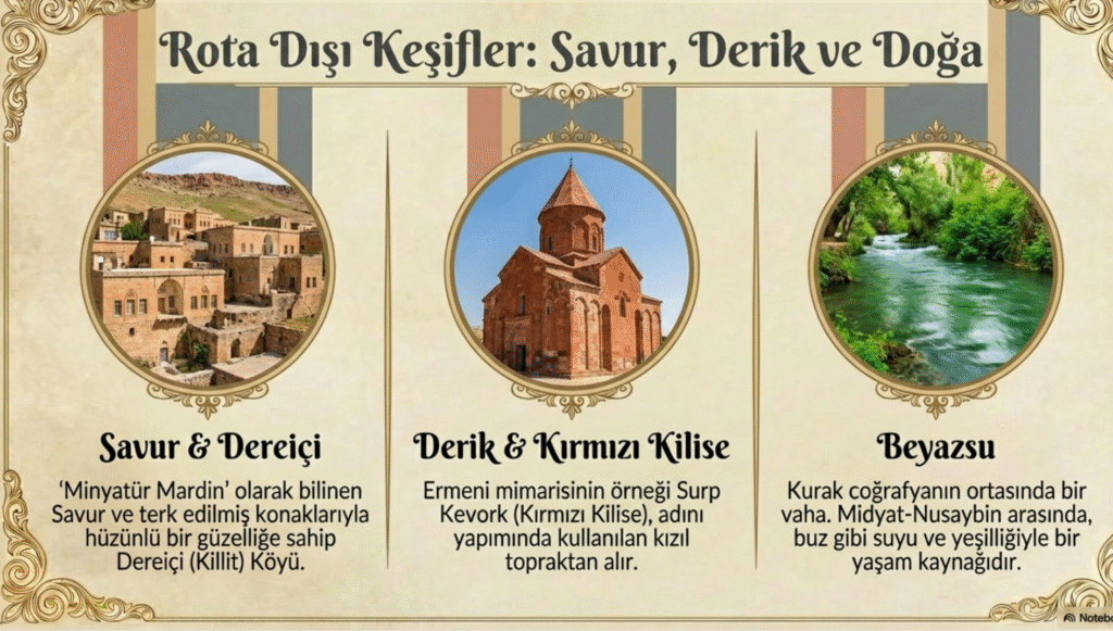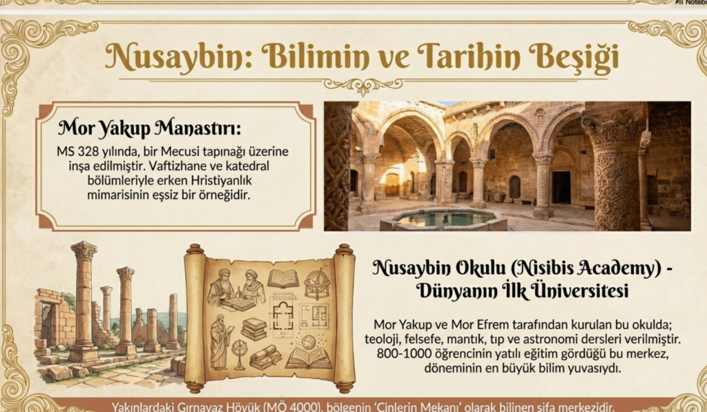 1600 yıllık bir yapı Deyer El’umur Manastırı, Marin, Ramanus, Telbisim antik kentleri ile Hamzayı Kebir Zaviyesi Külliye ve Türbesi, Cihangir Bey Zaiyesi, Zerkan suyu üzerinde, kireçtaşından, beş gözlü Artuklulara ait Kızıltepe- Dunyasır- Köprüsü, Firdevs Köşkü, Roma döneminde yapılan, İskender’in de içinden geçtiği Nusaybin- Zafer Takı bölgenin tarihine ışık tutan eserler olarak gezilip görülmesi gereken tarihi değeri olan önemli yapılardır.