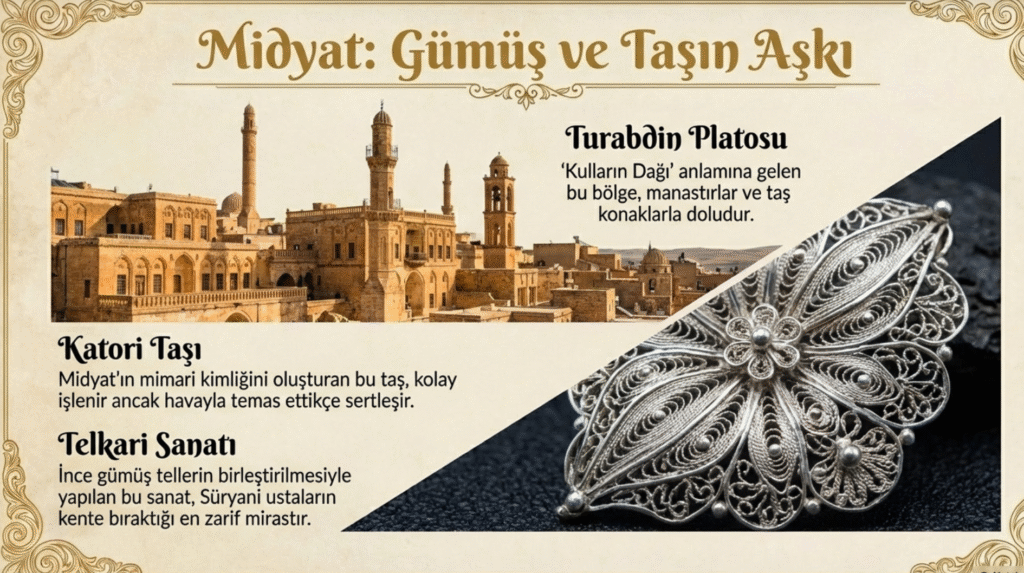 Midyat’ın tamamına yayılan kalori taşından yapılan taş ve Süryani evleri dar sokaklarda nefes almaya çalışmaktadır. Yüzlerce yıllık tarihiyle onarılarak günümüze taşınan evler, mimarileri ve süslemeleriyle dönemlerinin özelliklerini yansıtmaktadırlar.