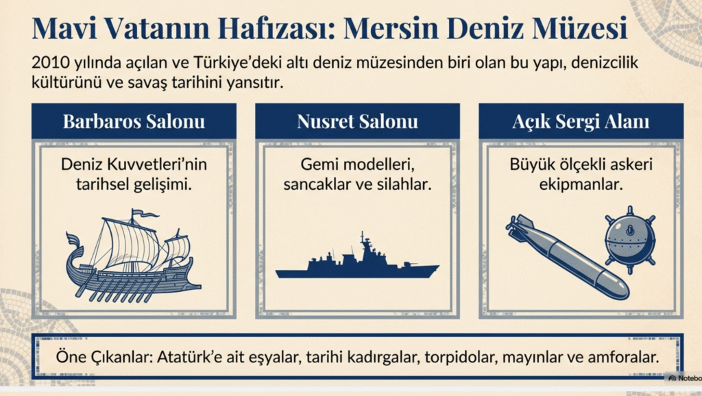Üç tarafı denizlerle çevrili bir Akdeniz kenti olan Mersin’e halka denizcilik kültürünü tanıtmak ve denizlerde yaşanan savaşları anlatan, üç ana sergi salonu-Barbaros, Nusret ve Açık Sergi Salonu- olan müzede Deniz Kuvvetlerinin tarihsel gelişimi de gözler önüne serilir.