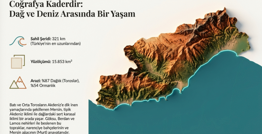 Yüzölçümü 15.853 km2 alanıyla Mersin ili Türkiye topraklarının yaklaşık % 0,49’unu oluşturmaktadır.