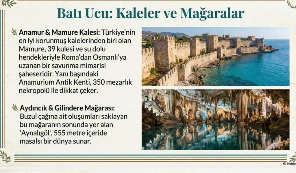 Ayrıca Anamur yakınlarında Fener Kulesi, Mamure Cami, Akcami, Kızıl Kilise ile kente 14 km uzaklıktaki Çamlıpınar Köyü’nde 16.- 17. yy. Çoban Kalesi, Çeltikçi Köyü yakınlarında da nekropol, sarnıç ve antik kent kalıntıları bulunan Boncuklu Kale ,Anamur’un pek çok tarihi yapı ve yapıtı- tiyatro, geniş surları, odeon, liman, toplantı yeri vb.-her yıl çok sayıda tatilci, tarih ve doğa sever tarafından ziyaret edilmektedir.