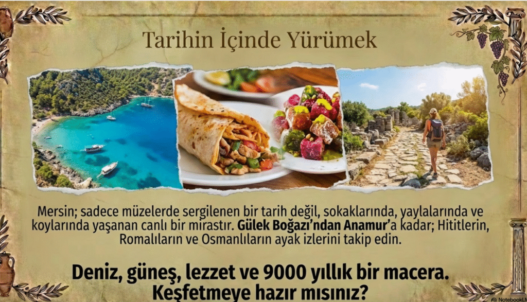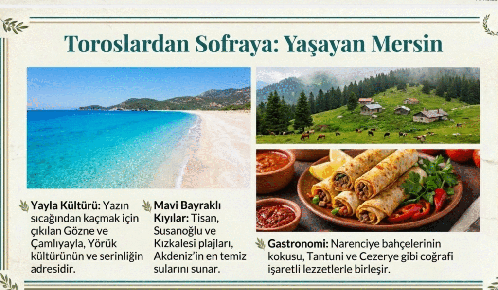 Ayrıca Mersin ve çevresi sahip olduğu tarihi ve doğal nitelikleri sayesinde inanç, kültür, deniz, yayla, doğa ve spor turizmine son derece uygun bir ildir.