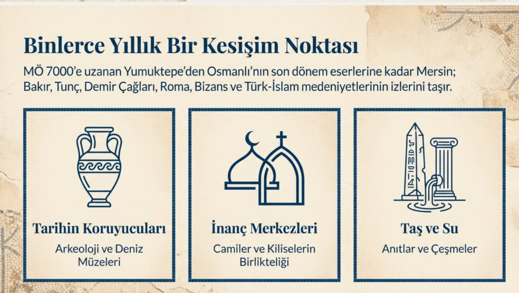Heredot’a göre ; Anadolu’da ilk yerleşimci kahramanlardan Fenikeli Kiliks’den dolayı Kilikya olarak adlandırılan bölgenin en önemli kentlerinden Mersin’in tarihi MÖ 10 bin- MÖ 7000- MÖ 6200 Neolitik (cilalı taş) devirden başlayıp MÖ 4500 Kalkolitik (bakır çağ) dönemden geçerek günümüze uzanmaktadır.