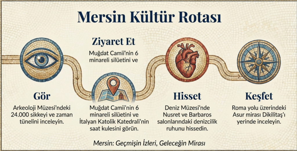 Mersin’de Gezilecek Yerlerin Adlarını Arama Motoruna Yazınız; Arkeoloji Müzesi, Deniz Müzesi, Eski Cami, Ulu Cami, Muğdat Cami, İtalyan Katolik Kilisesi-Katedral,Mersin – Bezm-i Âlem Valide Çeşmesi, Dikilitaş, Gözne Kalesi, Yumuktepe (Zephyrium) Antik Kenti ,Pompeipolis- Soloi, Solipolis- Soli ve Viranşehir , Erdemli- Kanlıdivane (Neopolis- Kanytella- Conytelis),Silifke- Uzuncaburç (Diokaiseria-Diocaesarea -Tanrı İmparator Kenti),Erdemli- Kızkalesi (Deniz Kalesi- Corycus- Korikos- Korykos) ,Erdemli-Adam Kayalar ve Kanyonu,Silifke( Selefkis- Selevkia- Seleukeia ad Kalykadnos ),Silifke- Uzuncaburç (Diokaiseria-Diocaesarea -Tanrı İmparator Kenti),
