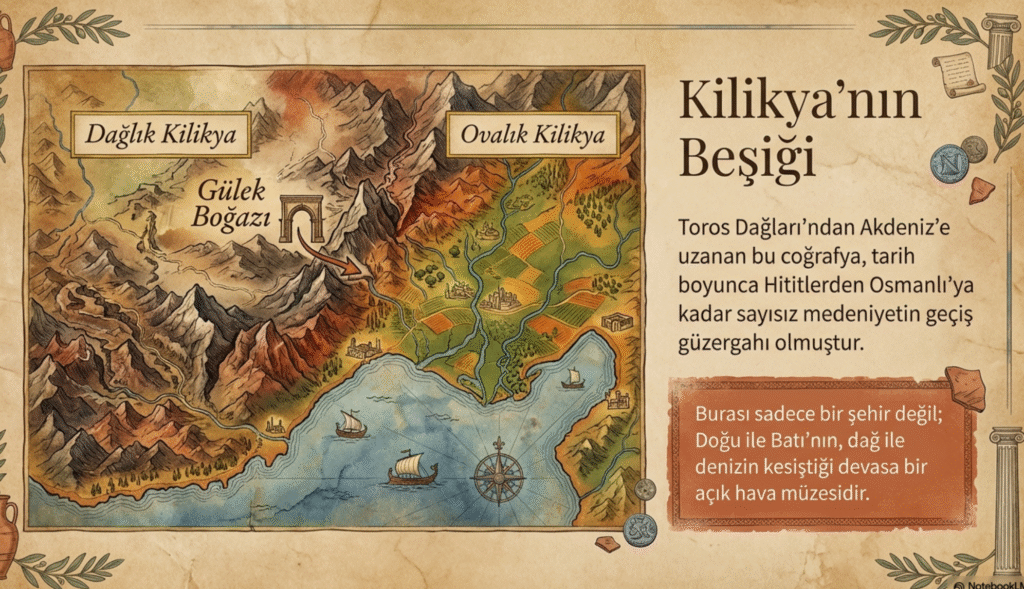 Coğrafi konumuna göre ; Dağlık (Trakhela-Korakesion (Alanya) Soloi -Pompeiopolis’e (Viranşehir) ve Ovalık (Pedias- Soloi -Pompeiopolis’e (Viranşehir)- Aleksandreia, İskenderun) Kilikya Bölgesi içinde yer alan Mersin, Anadolu’nun en eski yerleşim yerlerinden biridir.