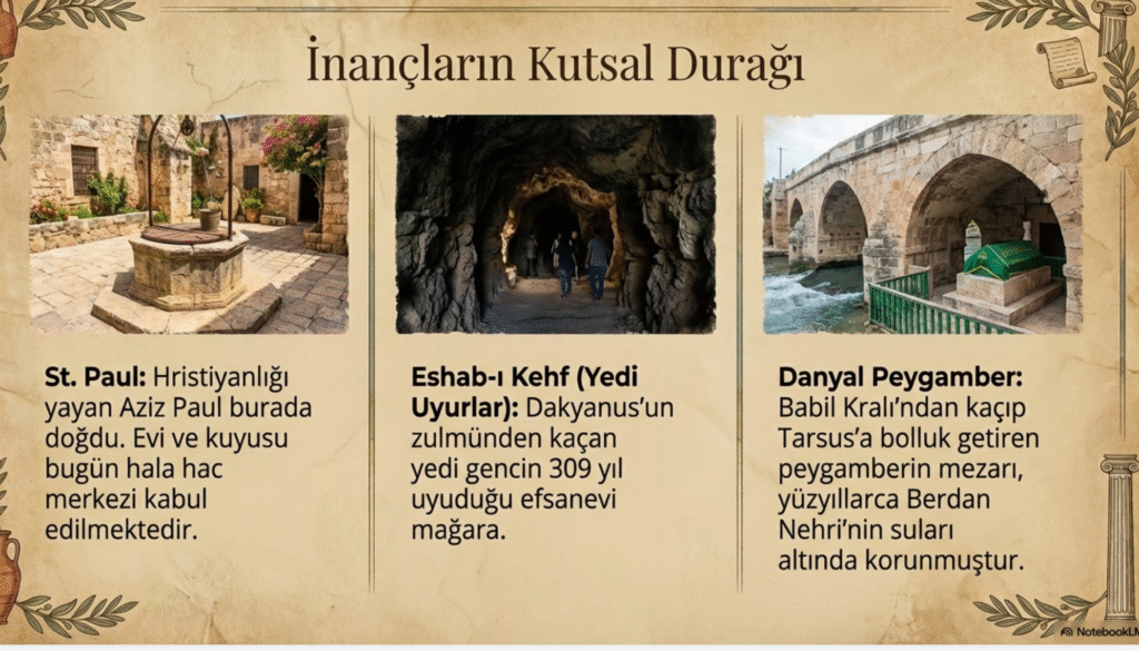 Dini mekânları ziyaret etmek isteyenler için de Tarsus- St. Paul Kuyusu ve Kilisesi, Ulu Cami, Hz.Bila-i Habeşi Makamı , Makam-ı Şerif Camisi, Hz Danial Türbesi, Eski Cami, Eshab-ı Kehf, Aya Thekla ve Alahan Manastırı vb. pek çok yer yerli ve yabancı ziyaretçilerin ilgilerini çekebilir.