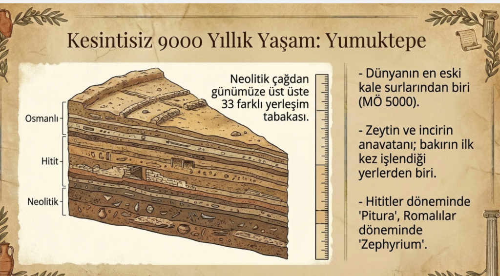 Kesintisiz 9000 ya da 8000 yıllık yerleşimin olduğu Yumuktepe’de yapılan kazılarda üst üste yığılarak 25 m yüksekliğinde 33 yaşam tabakası bulunmuştur.