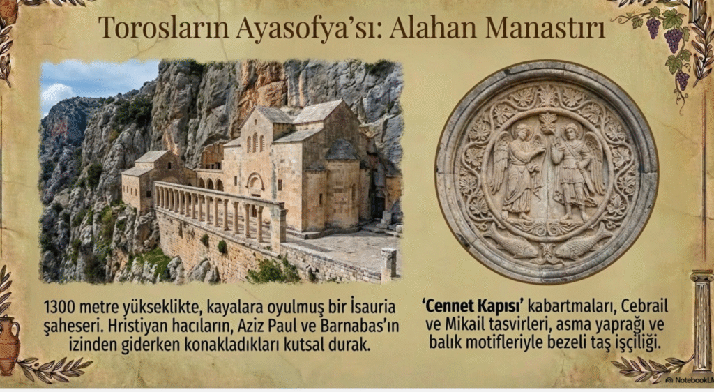 Ayasofya mimarisi özelliklerini taşıyan ancak kayalara oyularak yapılan Alahan Manastırı, batı- doğu kiliseleri mimari özelliğine göre yapılmıştır. Yapının sütun başlıkları oldukça dikkat çekicidir. Manastır, 5.ve 6. yy.’da birini Rahip Tarasis tarafından yaptırılan mezarlar ve keşiş odalarıyla birlikte oldukça büyük yapılar topluluğudur.