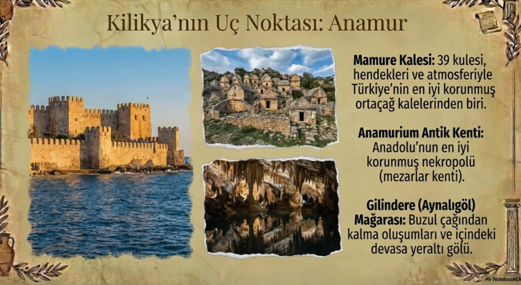 Helenistik çağda da önemli bir liman kenti olduğu bilinen Anamurium’un dikkat çekici kalıntıları;  kenti çevreleyen gözetleme kuleleriyle yöresel kireç taşından yapılan 1.5 km’lik surlar ( bazı kısımları 8 m yükseklikte), 1. ve 4. yy. arasında moloz taştan yapılan beşik tonozlu, iki katlı, bir veya iki odalı  350 mezarın olduğu nekropol Anadolu’nun iyi korunan Roma mezarları, yaklaşık 350 adet mezarda kuş, tavuk kuşu, balık, çiçek, girlantlı, çeşitli hayvan figürlü, Medusa başı, baklava desenli, kırmızı, yeşil, sarı, yeşil ve siyah renkli ve kabartmalı freskler, kentin kuzeydoğusunda doğu-batı yönlü döşeli su kemerleri ve ssu sarnıçları kalıntıları, 900 kişilik odeon, 2. yy. yarım daire  tiyatro, tabanı mozaiklerle bezeli, 100 m uzunluğunda 1000 m2’lik gymnasium ve  3 ısınma odası ve 2 yüzme havuzu olan hamam kalıntıları, balıkçı, inşaat, çömlekçi,  dokuma, terzi ve oyun aletleri, kurşun mühürler, kantar ağırlığı, sikkeler, makyaj malzemeleri, bilezik, anahtar, kilit, kemer tokaları vb. olarak sıralanabilir.