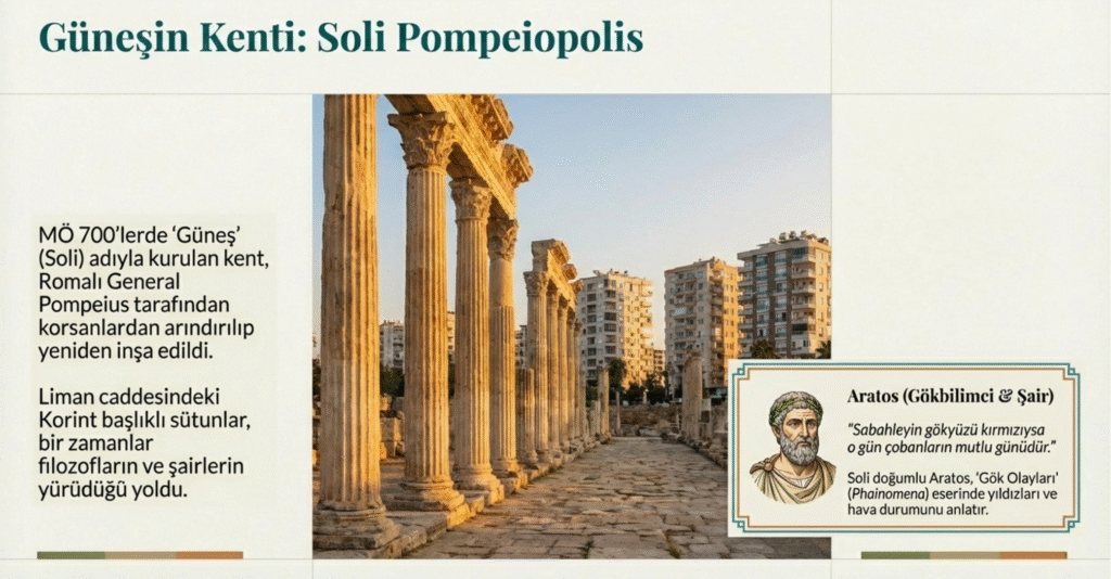 MÖ 106 -MÖ 48 Roma İmparatoru General Pompeius Akdeniz sahilinde ve dağlık Kilikya’daki korsan gemilerine el koymuş, Soli gibi nüfusu azalan kentlere bu korsanları yerleştirip yeniden inşa ettirmiştir. Böylece kentin adı da Pompeipolis- Pompeius’un Kenti olarak değiştirmiştir.