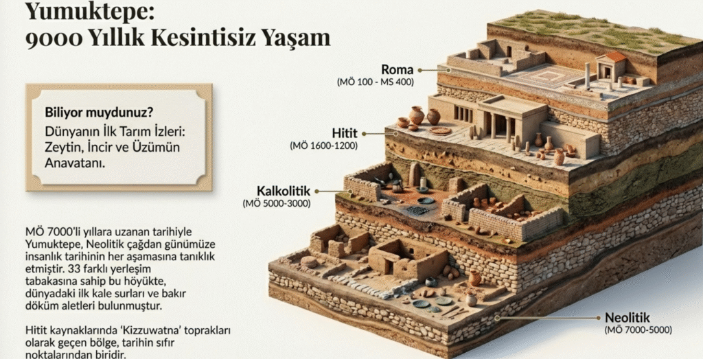 Kesintisiz 9000 ya da 8000 yıllık yerleşimin olduğu Yumuktepe’de yapılan kazılarda üst üste yığılarak 25 m yüksekliğinde 33 yaşam tabakası bulunmuştur.