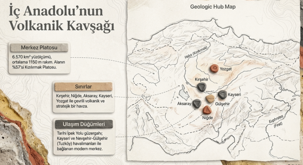 Denizden ortalama 1150 m yükseklikteki Nevşehir ili ve çevresi, % 18 sönmüş volkanik dağlar ve yüksek tepelerle – 1982 m Erdaş, 1949 m Hodul, 1768 m Kızıldağ, 1622 m Oylu, 1530 m Kemil dağları– çevrili ve bölge yüzeyi bu dağların – 3916 m Erciyes, 2963 m Melendiz, 3268 m Hasan– atıkları çeşitli renk- sarı, siyah, beyaz, kahverengi ve yeşil vb.– ve sertlikte taş- tüf, onyx, obsidien, çakmaktaşı, bazalt vb.– ile kaplıdır.