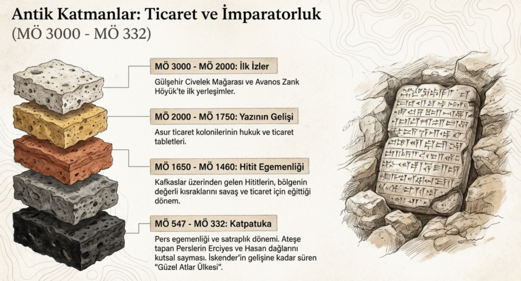 MÖ 2000 – MÖ 1750 Kapadokya’nın daimi yazıyla tanışmasına öncülük eden Asur ticaret kolonilerine ait çeşitli konuların işlendiği -hukuk, ticaret, tarım, sosyal ve aile yaşamı vb. -çok sayıda tablet bölgenin tarihine ışık tutmaktadır.