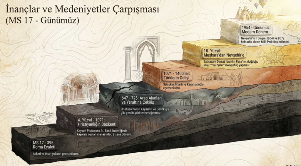 Ardından bir süre Emevilerin de yaşadığıNevşehir’i de içine alan Kapadokya, Türkler- Selçuklularla 1071 yılında tanışmıştır.