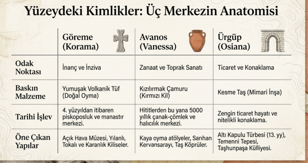 Bunlara ek olarak ziyaretçilerin oldukça ilgisini çeken Ürgüp’e bağlı Pancarlık, Üzengi Vadisi, Keşlik Manastırı, Karamanoğulları dönemine ait cami ve kümbetleri olan Damsa- Taşhunpaşa Külliyesi, Damsa Barajı, Sinasos- Mustafapaşa– da dikkat çeken tarihi ve doğal mekanlardır.