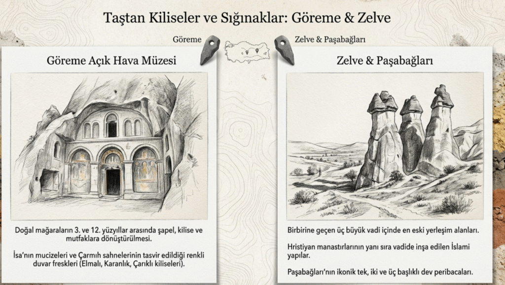 Göreme Açık Hava Müzesi2ni de içine aalan vadideki çok sayıdaki sığınak ve oyuk Hıristiyanlar tarafından 3. yy. dan 12. yy. arası dini mekânlara- şapel, kilise, manastır, mutfak vb.- çevrilmiştir.