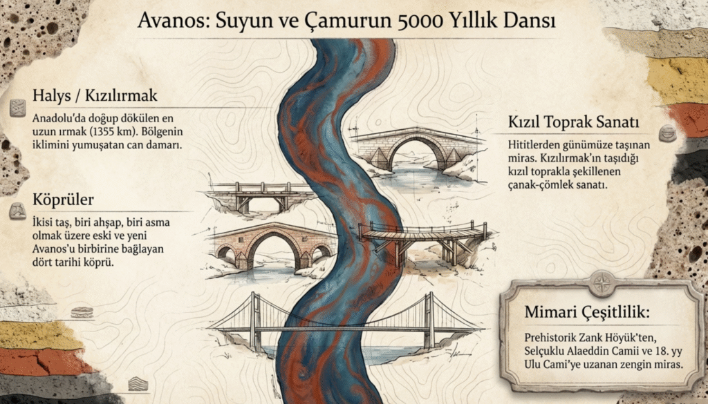 Avanos’un iklimini de bölge geneline göre daha ılıman yapan, Anadolu topraklarında doğan yine bu topraklara dökülen en uzun – 1355 km.- ırmak olan Halys- ırmak olan Kızılırmak, ilçedeki dört köprüsü ile -ikisi taş biri ahşap ve asma- eski ve yeni Avanos’un iki yakasını birbirine bağlamaktadır.